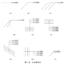 引出线。由图样引出一条或多条线段指向文字说明,该线段就是引出线。引出线与水平方向的夹角一般采用0、30、45、60、90度。