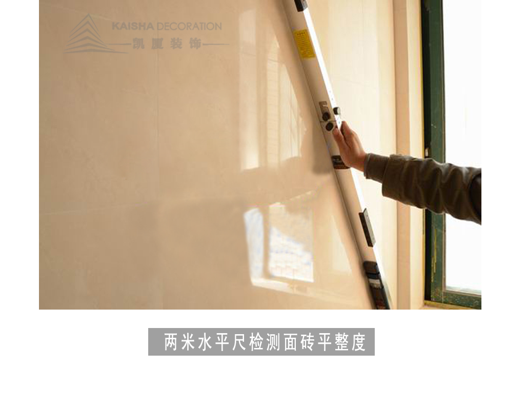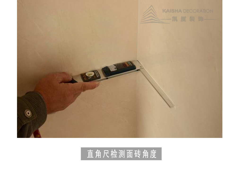 1、质检人员正在检测墙面砖平整度。