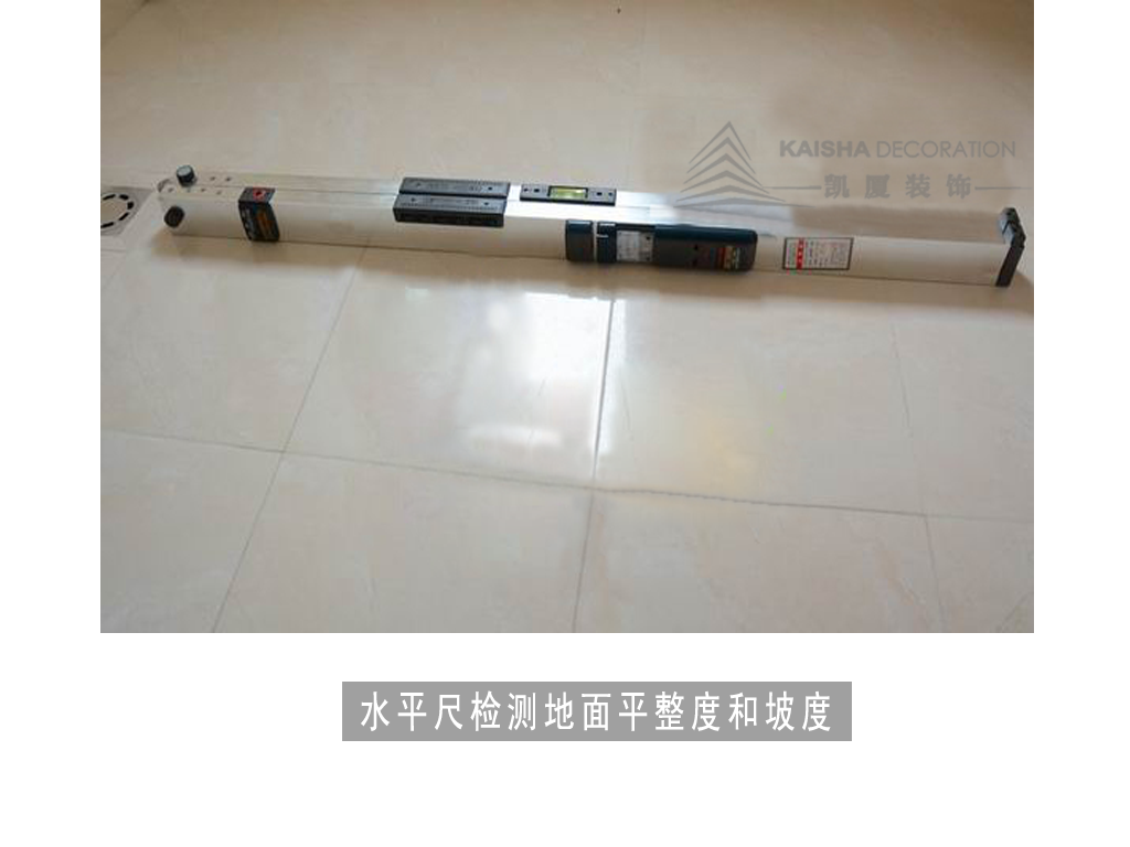 4、质检人员正在检测卫生间地面平整度和坡度。